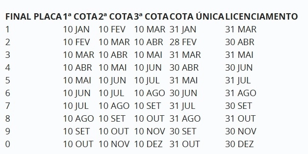 Cota única: o imposto deve ser quitado até o final de cada mês, de acordo com o final de cada placa – o prazo para placas com final 1 vai até 31 de janeiro;