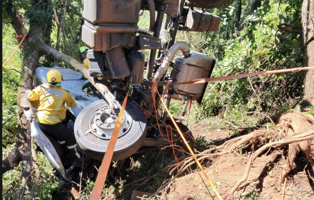 Após a retirada da vítima, foi necessário o uso de técnicas de salvamento em altura e sistema de cordas para remover o caminhoneiro da ribanceira.