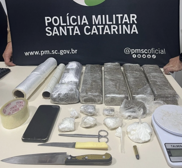 No local, foram encontradas duas mochilas com aproximadamente 3,3 quilos de maconha, além de mais 70 gramas de cocaína, 5 gramas de crack, munição calibre .38, uma balança de precisão, embalagens e objetos utilizados para fracionar a droga.